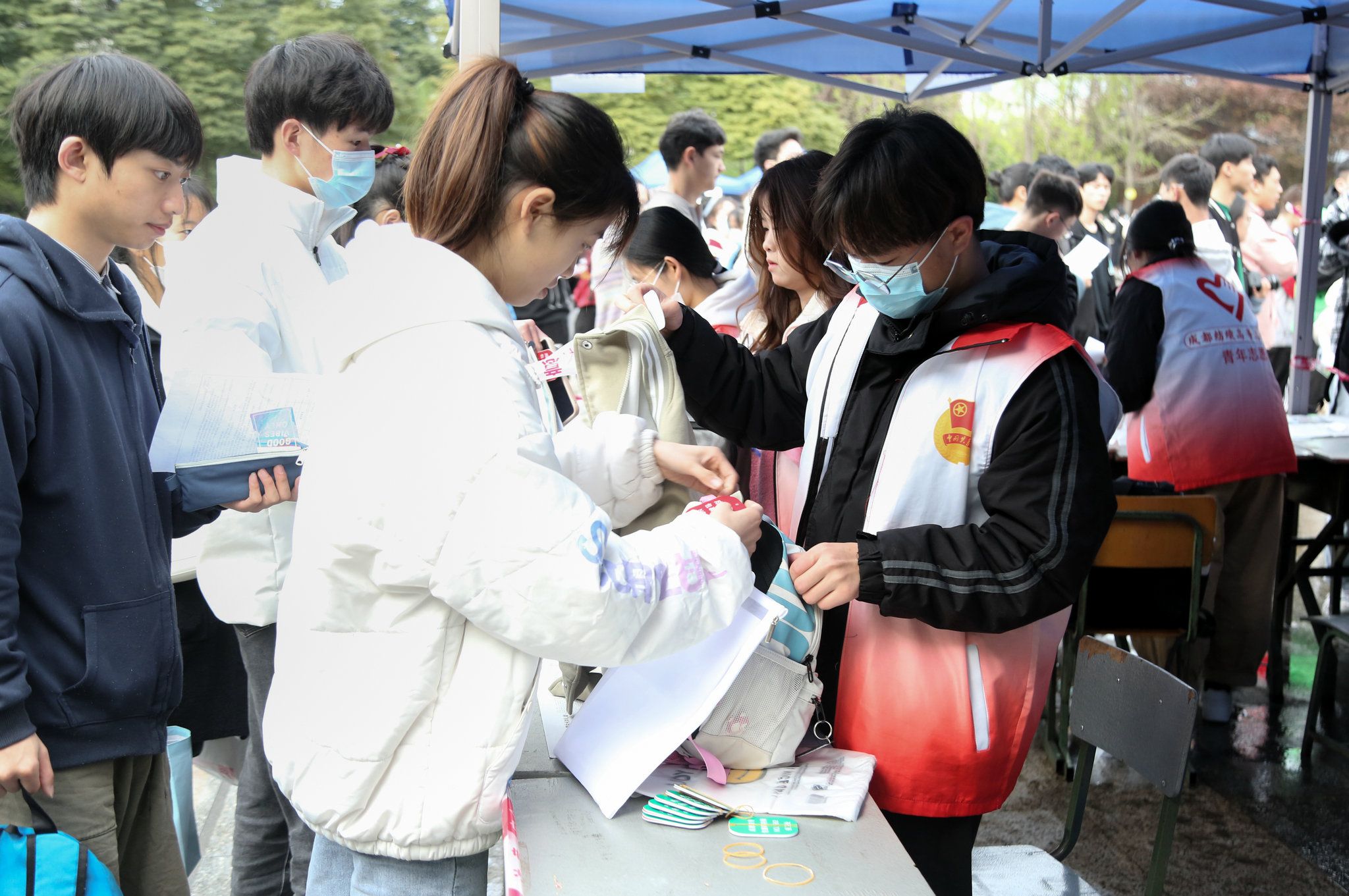 单招现场秩序井然,学校各部门紧密配合,各司其职,有关工作人员严守岗位,各负其责;保卫人员站在警戒线前组织纪律,学生志愿者以积极的面貌和热情的态度,认真地为学弟学妹们解疑答惑。