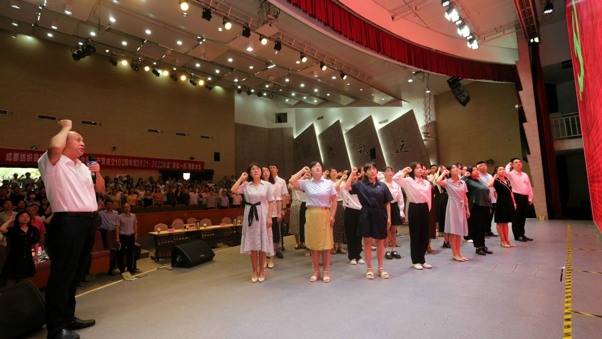7月7日,学校在南苑多功能厅隆重召开庆祝中国共产党成立102周年暨2021-2022年度“两优一先”表彰大会。党委书记蔡玉波强调,全校上下要完整、准确、全面贯彻新发展理念,更好地服务和融入新发展格局,以成渝地区双城经济圈建设为总牵引,贯彻落实中共四川省委十二届三次全会精神,聚焦服务轻工纺织产业,深入推进产教融合、校企合作、科教融汇,为加快建设“成都轻纺工程职业技术大学”,为产业集群发展提质增效、转型升级,为区域经济社会发展,培养人才、提供服务,为强国建设、民族复兴作出新的更大的贡献。