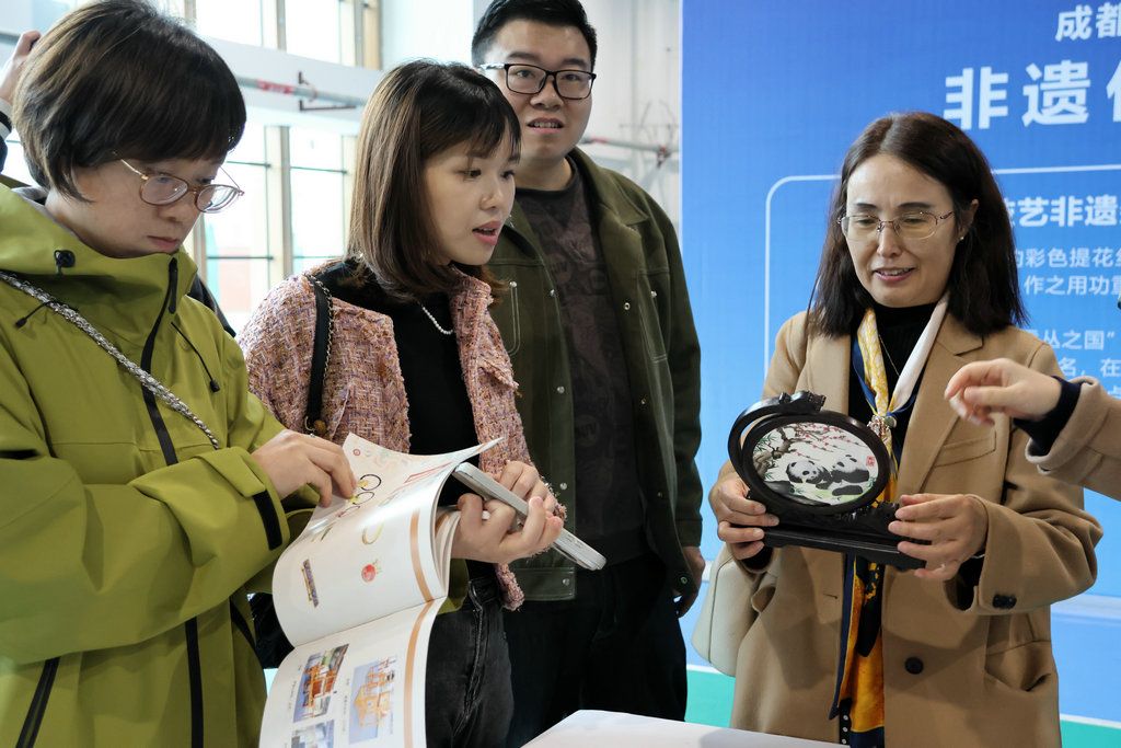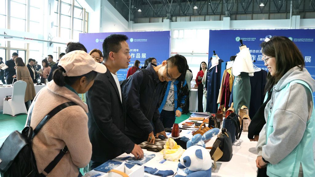在体育馆,返校校友观看了非遗作品及文创作品展。织绣技艺非遗数字化保护与传承四川省文化和旅游厅重点实验室、纺织工程学院、服装工程与设计学院、艺术设计与创意学院携手展出了精美、实用的蜀锦、蜀绣及文化创意作品,令校友们流连忘返、爱不释手。部分作品被校友们当场抢购,部分校友还现场与工作人员和相关负责人联系订制、订购事宜。