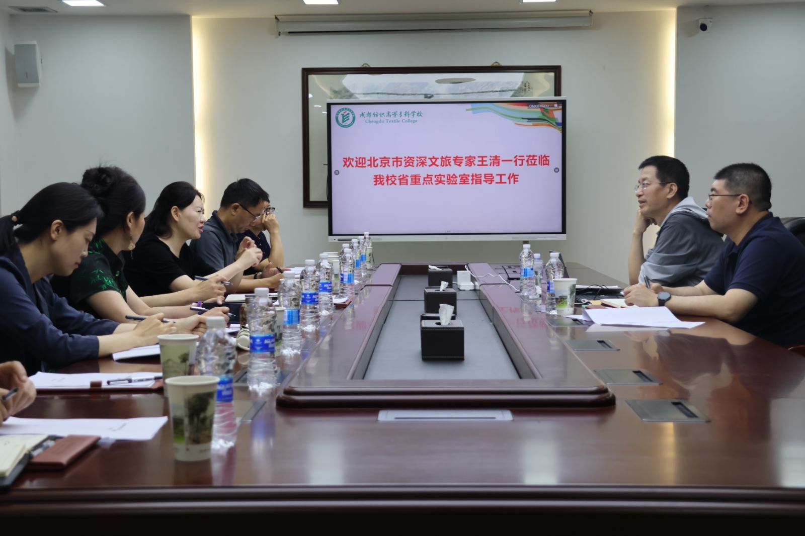 任迎伟对王清一行的到来表示欢迎,简要介绍了学校办学历史、办学特色,并重点介绍了学校在织绣技艺非遗数字化保护与传承创新中的实践成果,以及省织绣技艺数字化重点实验室获批以来,形成的一套完整的传统工艺数字保护体系。他表示,省织绣技艺数字化重点实验室不仅承担着文化传承的学术使命,还肩负着推动传统工艺融入现代生活的创新任务,希望通过学习借鉴北京经验,培养具备传统技艺传承与现代创新能力的复合型人才。