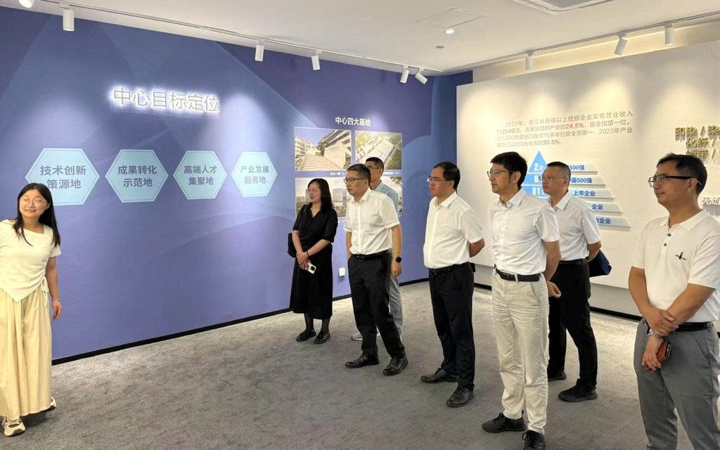 随后,调研团队前往浙江绍兴,走访了绍兴市柯桥区中国轻纺城建设管理委员会。任迎伟一行详细了解中国轻纺城在纺织产业集群发展、市场运营管理、品牌培育等方面的创新举措,与管委会重点探讨市场与院校、企业协同推进纺织人才培养的合作模式,并就双方在平台共建、科研合作等领域的可能性交换了意见。下午,任迎伟一行调研浙江现代省现代纺织技术创新中心,详细了解中心运行机制,表示未来学校将计划在柯桥建立相应机构,借助柯桥产业优势精准对接产业需求,推进学校人才培养和科研合作。
