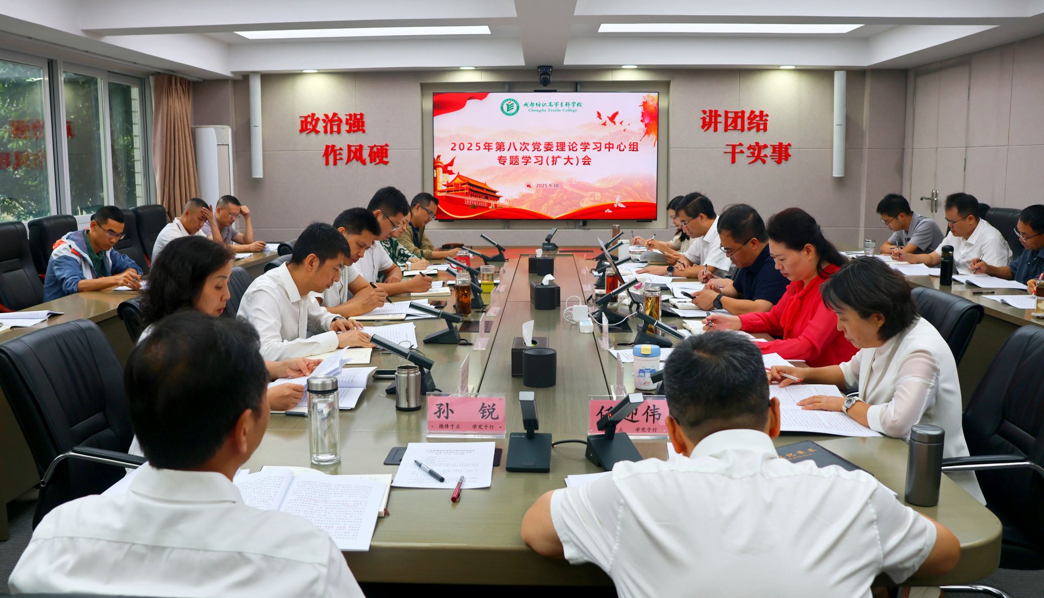 9月30日,学校党委理论学习中心组召开2025年第8次专题学习(扩大)会。党委书记任迎伟主持学习会并领学习近平总书记重要文章《培养德智体美劳全面发展的社会主义建设者和接班人》,党委副书记周红领学习近平总书记重要文章《思政课是落实立德树人根本任务的关键课程》。党委副书记、校长孙锐等全体校领导分别结合工作实际交流了心得体会,党委常委、部分职能部门负责人按照要求提交了书面交流发言材料。学校党委理论学习中心组成员、党委委员、立德树人工作办公室成员、相关职能部门负责人参加学习会。