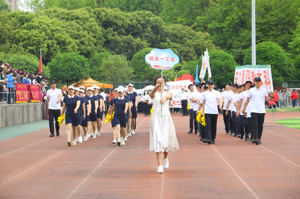 9点整,各方阵及代表队入场仪式准时开始。伴随着欢快的进行曲,国旗护卫队踏着整齐、铿锵有力的步伐入场,运动场掌声、欢呼声响彻一片;跟在后面的有彩旗方队、鲜花方队、裁判员代表队及各分工会代表队。师生们衣着整齐、步履坚定、精神振奋、口号嘹亮,展现了良好的精神面貌与青春活力。