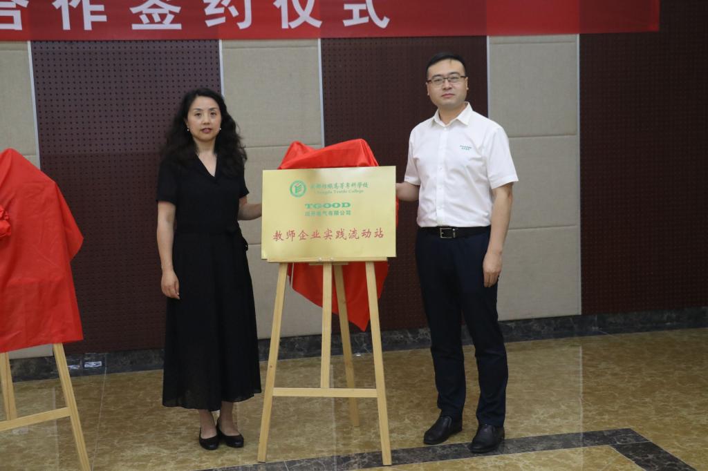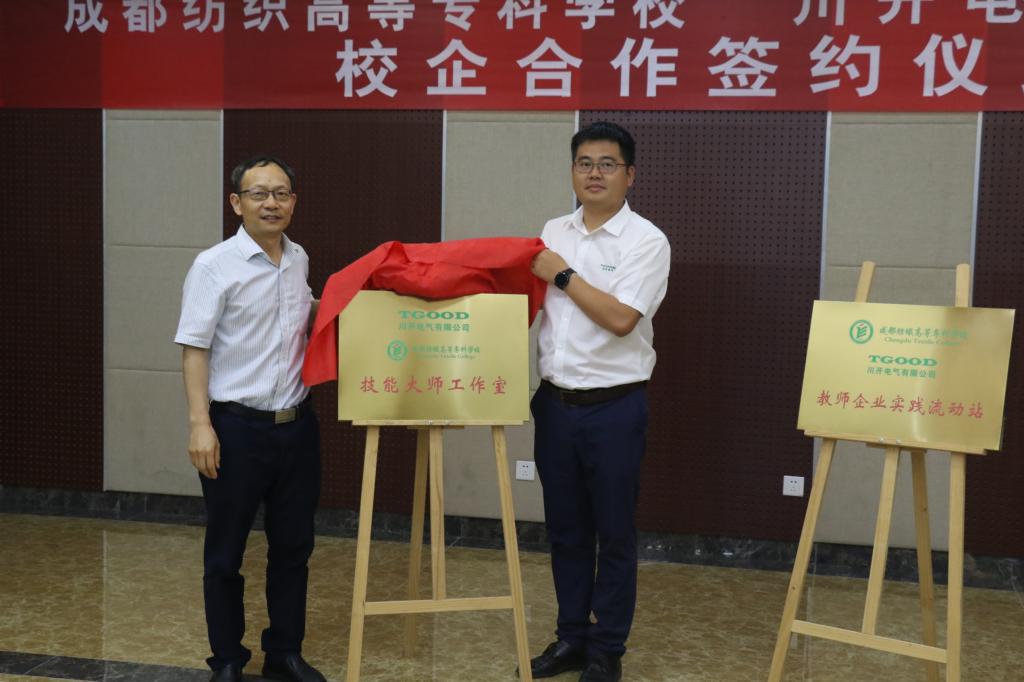 签约仪式上,学校党委常委、纪委书记张江婴和川开电气副总经理张爱宝共同为教师企业流动站揭牌;电信学院院长黄勤陆与川开电气智研院院长刘世旭一起为技能大师工作室揭牌。