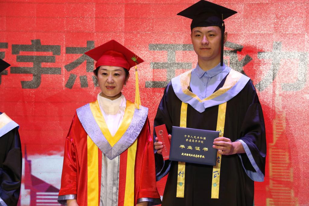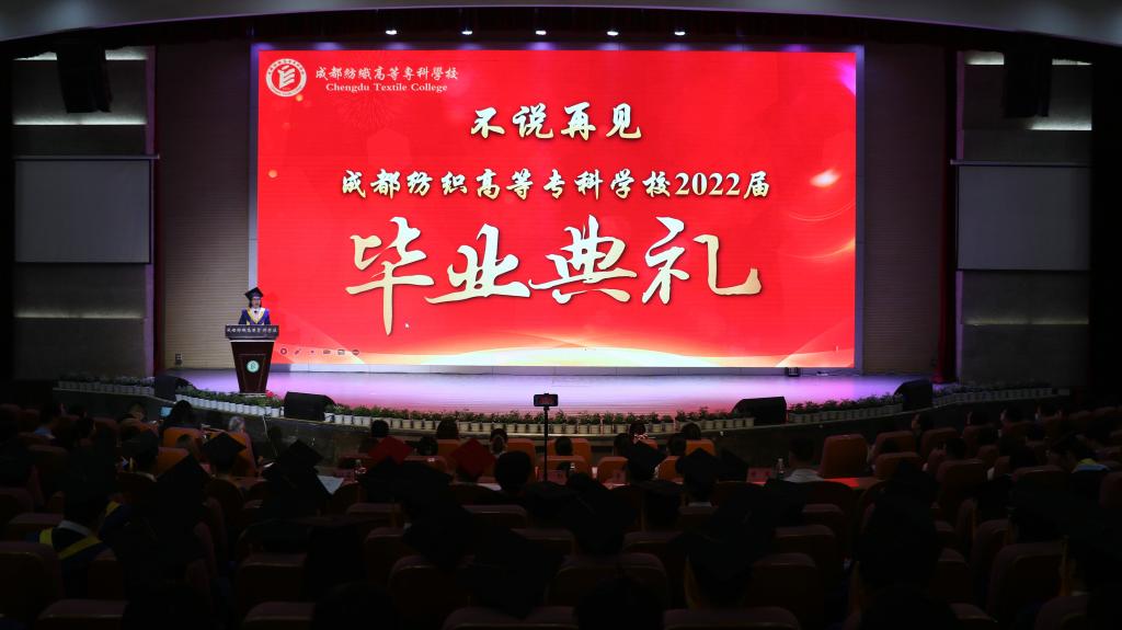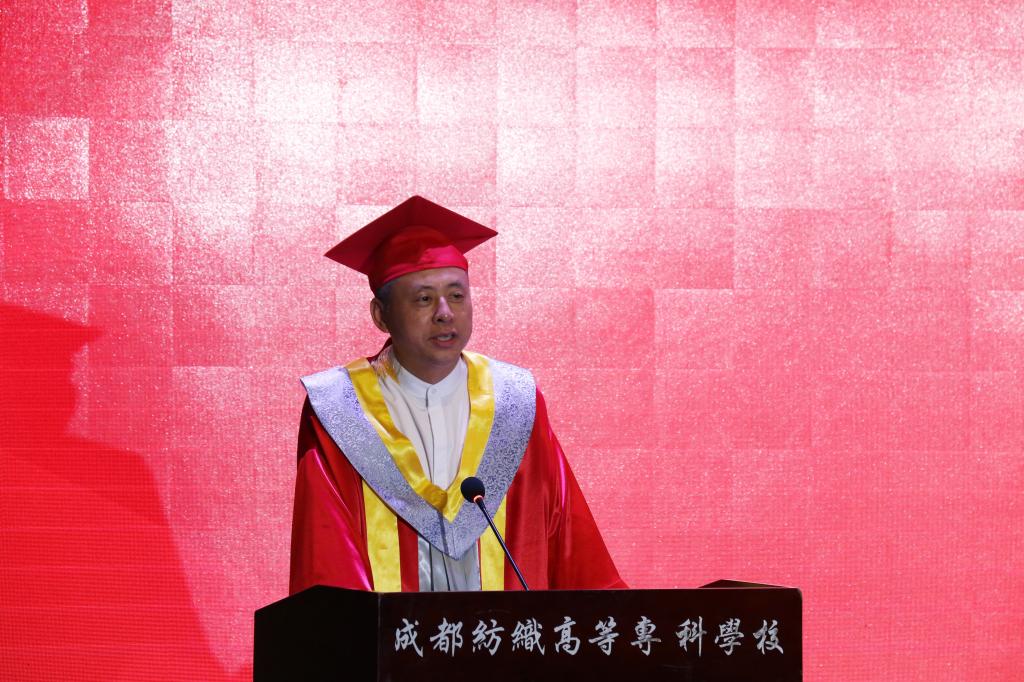 典礼在庄严的国歌中拉开序幕。石静校长以“存鸿鹄志,博人生精彩”为主题,为毕业典礼致辞。她向全体教职员工、学生家长、校友表示衷心的感谢,为同学们在疫情大考面前表现出来的勇敢和担当感到骄傲。回顾同学们的在校三年,学校迎来了国家“双高”校建设、“十四五”规划、邛崃产教园区建设等重大发展机遇,在各种全国普通高校大学生竞赛中屡获佳绩,她感谢同学们为学校增光添彩。她寄语毕业生:存鸿鹄志,要有不断学习之心,放眼长远、戒骄戒躁、不断学习,不断拓宽视野,扩大格局,获取幸福而精彩的人生。存鸿鹄志,要有自信之心,要不负时代,不负韶华,要有敢做敢拼的勇气,坚定自己的自信,脚踏实地砥砺前行。存鸿鹄志,要有感恩之心,懂得感恩父母亲友,感恩老师,感恩身边的每一个人。存鸿鹄志,要有拼搏之心,希望同学树立热爱劳动,学习劳模的精神,做到“德技兼修”,早日成为技术能手和大国工匠,奉献、活跃在祖国建设的一线。她希望毕业生们毕业之后,能常回家看看,期待毕业生们不断地拼搏奋进,在今后的岁月里创造出属于成纺人的精彩人生!