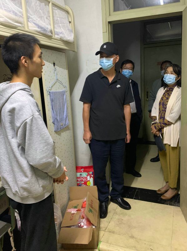 蔡玉波一行分别来到南北苑学生宿舍,亲切询问同学们生活及线上学习情况。“网课上得怎么样”“生活上有无困难”“跟父母家人联系报平安没有”“能否理解防疫政策和措施”等等。