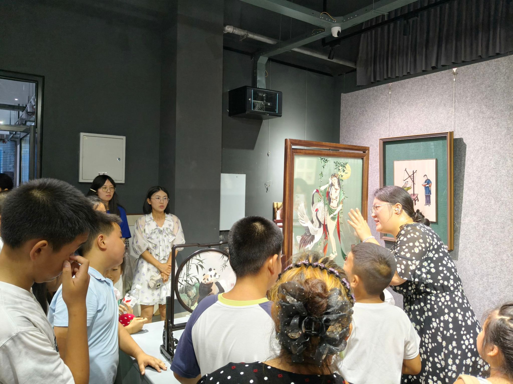 在蜀绣中心,老师向孩子们介绍双面绣的独特技艺,并带领他们参观往届同学的蜀绣作品,让孩子们近距离感受了非遗的魅力。
