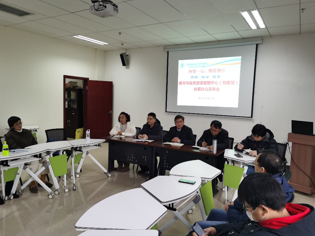 1月12日下午,学校档案馆与图书与信息资源管理中心合署办公宣布会在图书馆一楼电子阅览室召开。学校党委组织部部长刘文钦、图信中心协管干部党政办杨浩主任和新成立的图书与信息资源管理中心(档案馆)全体在校教职工参加了本次会议。