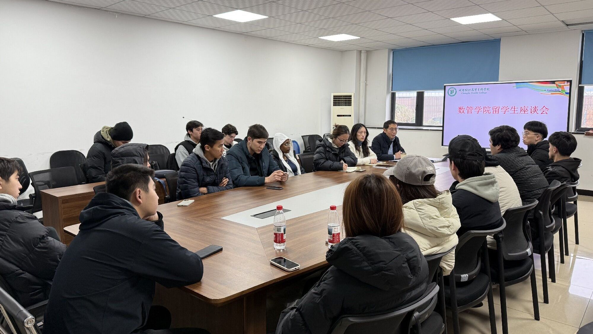 期末临近,为切实了解留学生本学期在校学习生活情况,进一步规范留学生管理工作,强化留学生纪律意识,12月24日上午,数管学院在融创楼A402组织召开了留学生期末座谈会。学院党总支书记王霖、党总支副书记何酉宁、副院长凌书娟、专任教师徐杨森及学院全体留学生参加会议,王霖主持会议并讲话。