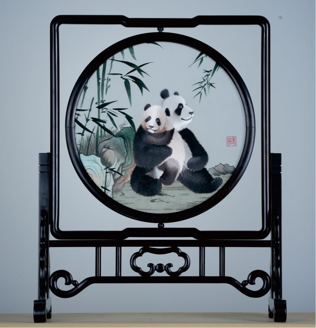 《锦丝连梦・中法情圆》以中法友谊结晶——大熊猫“圆梦”为核心题材,将“中国名片”熊猫与东方瑰宝蜀绣完美融合。作品由织绣技艺非遗数字化保护与传承四川省文化和旅游厅重点实验室牵头,与学校蜀绣中心、创艺学院等相关教师共同创作,由国家级技能大师工作室负责人邬学强耗时三月匠心绣制。作品采用蜀绣双面绣“双面同辉,虚实相生”的至高技艺,以丝毛、滚、切等六法精髓,精准复刻熊猫灵动神韵,辅以国画意境的翠竹山石,达成“丝赋形神,绣寄丹青”的艺术境界,成为非遗赋能文明对话的生动实践。