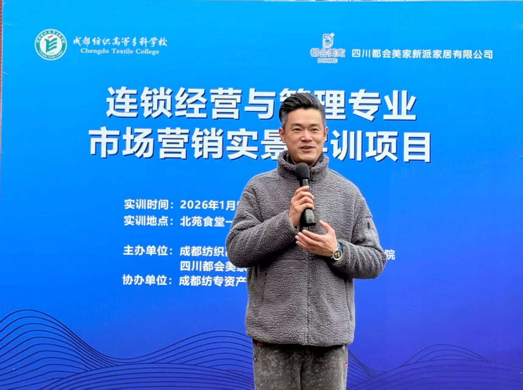 实训赋能,实战启航。1月5日,作为连锁经营与管理专业市场营销实景实训项目,都会美家纺专实训店在北苑餐厅隆重开业。四川都会美家新派家居有限公司董事长助理赖常富,学校资产经营公司党支部书记申昕,数管学院党总支书记王霖、副院长(主持工作)何凌、副院长凌书娟、连锁专业负责人陈泓樾及全体教师、连锁2024级实训学生代表出席开业仪式。仪式由连锁专业教师陈雨生主持。