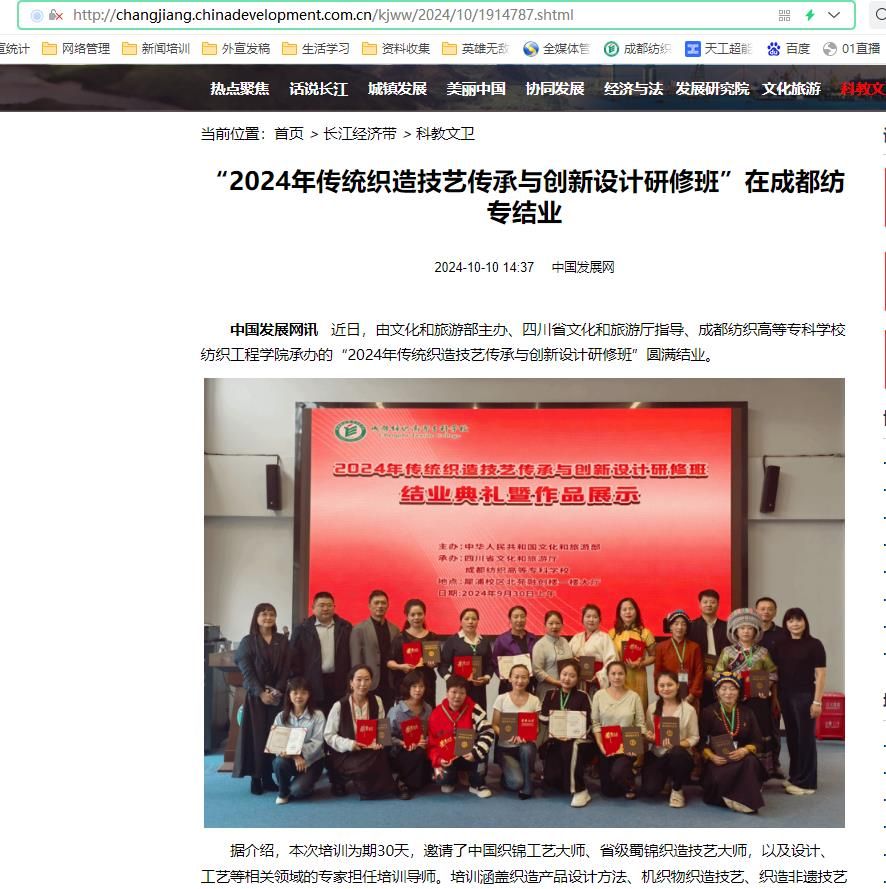 中国发展网讯 近日,由文化和旅游部主办、四川省文化和旅游厅指导、亚洲午夜成人满18免费网站纺织工程学院承办的“2024年传统织造技艺传承与创新设计研修班”圆满结业。