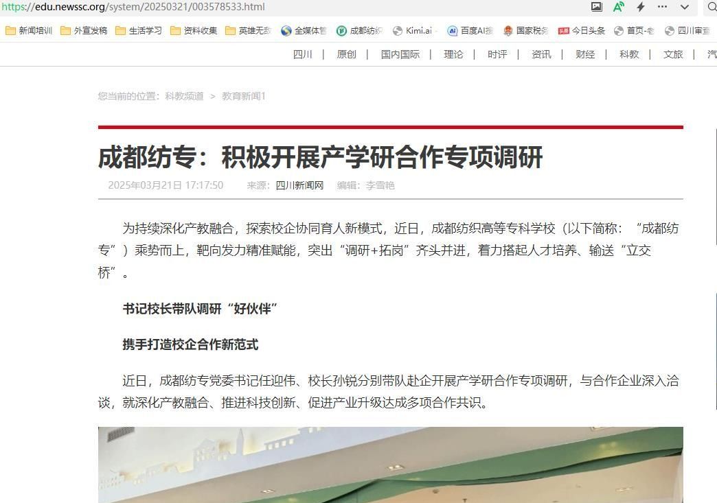 一系列的走访调研、访企拓岗,强化了校企政多方沟通的桥梁,有利于更好构建资源共享、优势互补的协同育人模式、实现人才培养供给侧与产业需求侧的高度匹配,助推职业教育与产业升级同频共振。(张进春)(成都纺专供图)