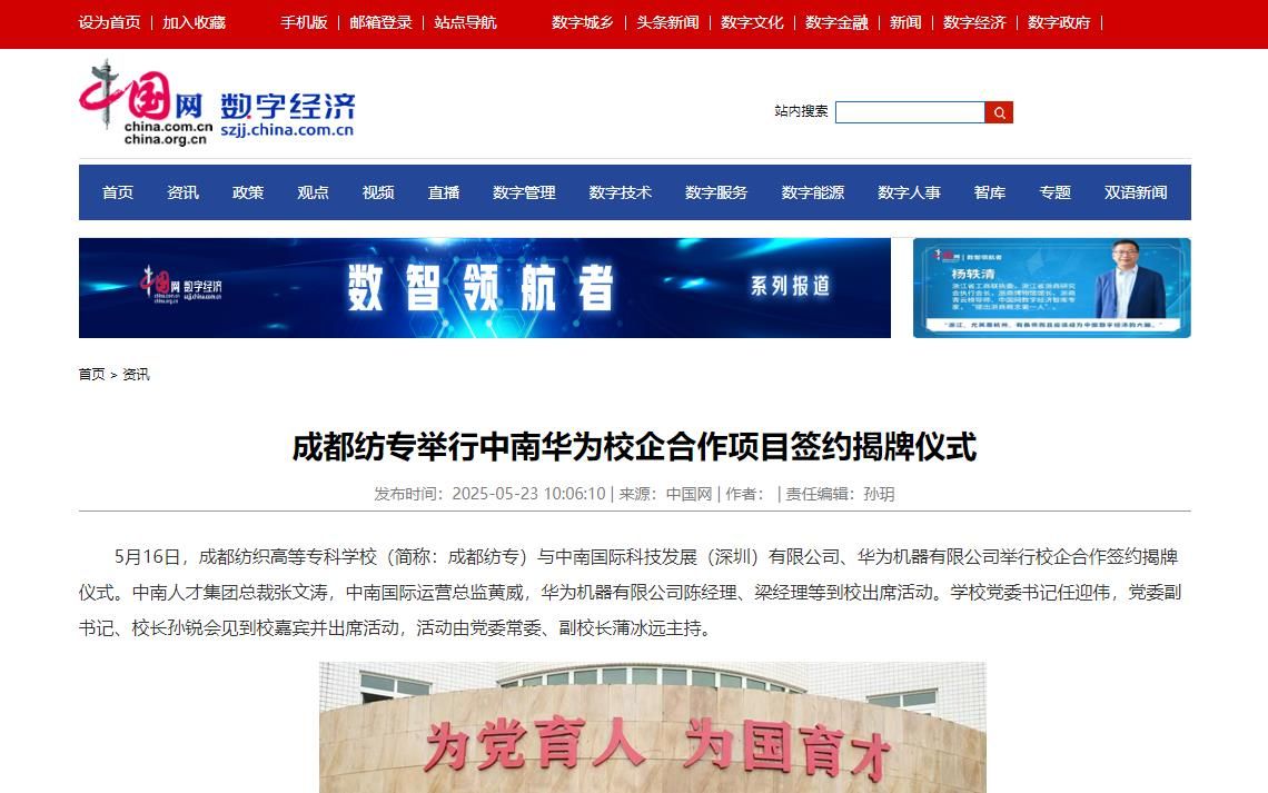 5月16日,亚洲午夜成人满18免费网站(简称:成都纺专)与中南国际科技发展(深圳)有限公司、华为机器有限公司举行校企合作签约揭牌仪式。中南人才集团总裁张文涛,中南国际运营总监黄威,华为机器有限公司陈经理、梁经理等到校出席活动。学校党委书记任迎伟,党委副书记、校长孙锐会见到校嘉宾并出席活动,活动由党委常委、副校长蒲冰远主持。
