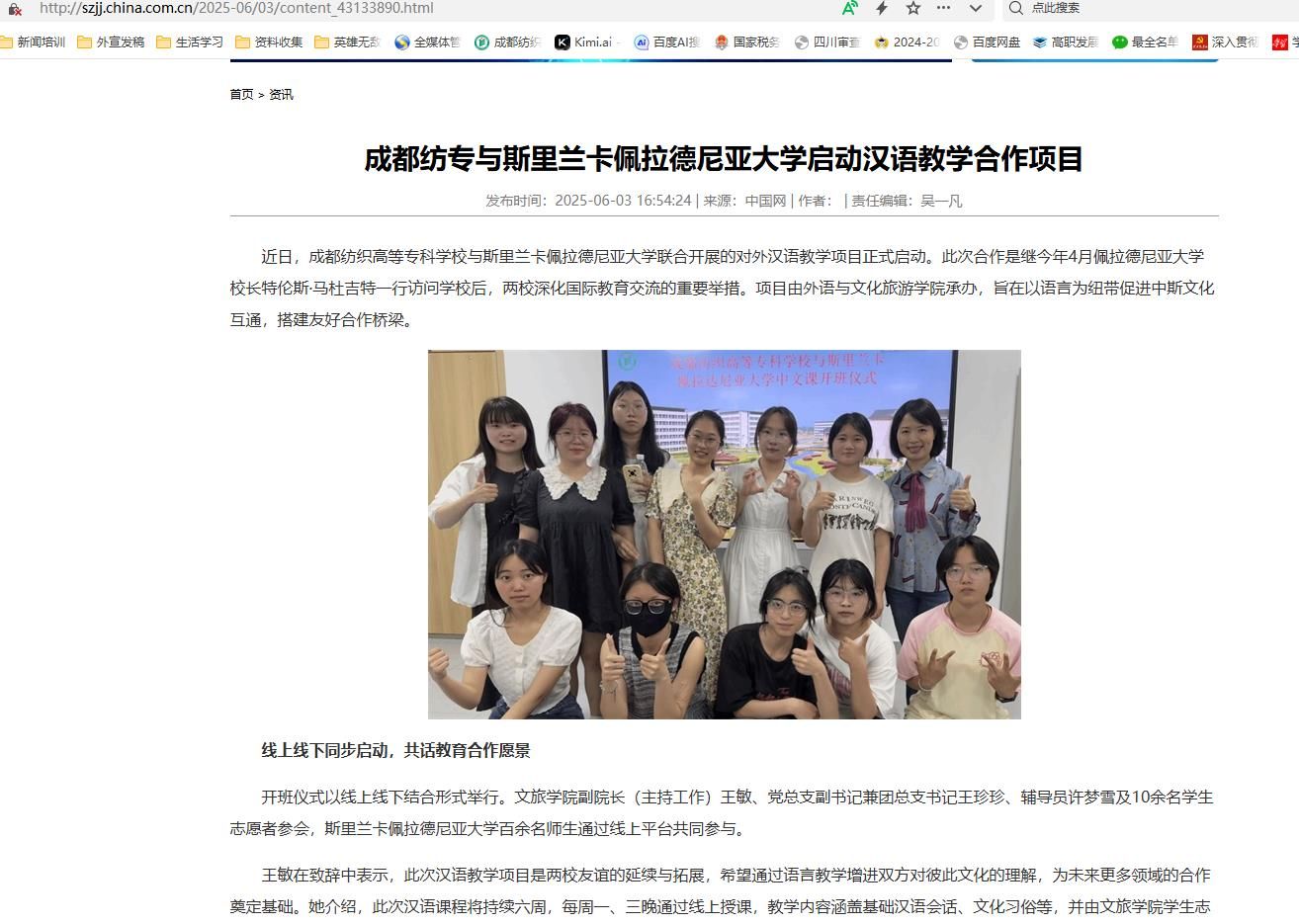 此次汉语教学项目是成纺积极响应共建“一带一路”倡议、推进国际化办学的实践探索。通过学生志愿者参与教学,学校为佩大师生提供了学习中文的窗口,也为中国青年学子搭建了国际交流平台。未来,两校计划在语言教育、文化交流、职业技能培训等领域进一步拓展合作,为增进中斯人文交流注入新活力。成纺将持续发挥职业教育特色优势,探索更多元化的国际教育合作模式,为共建“一带一路”贡献职教力量。(许梦雪、成都纺专)