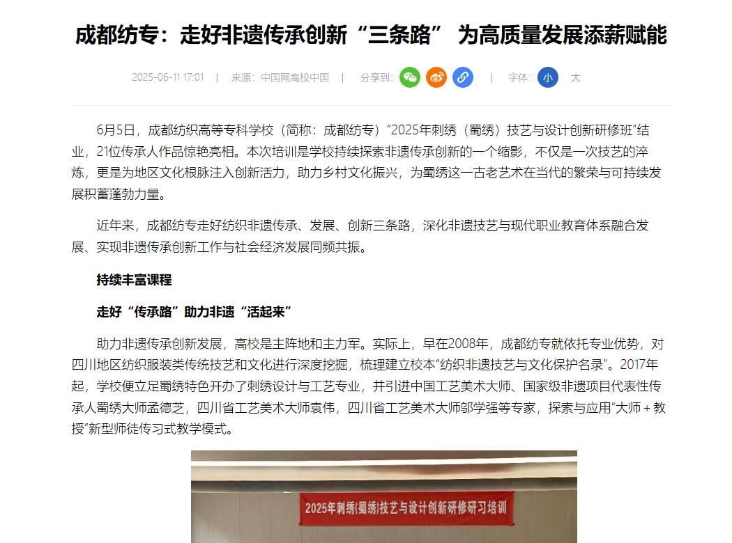 近年来,成都纺专走好纺织非遗传承、发展、创新三条路,深化非遗技艺与现代职业教育体系融合发展、实现非遗传承创新工作与社会经济发展同频共振。
