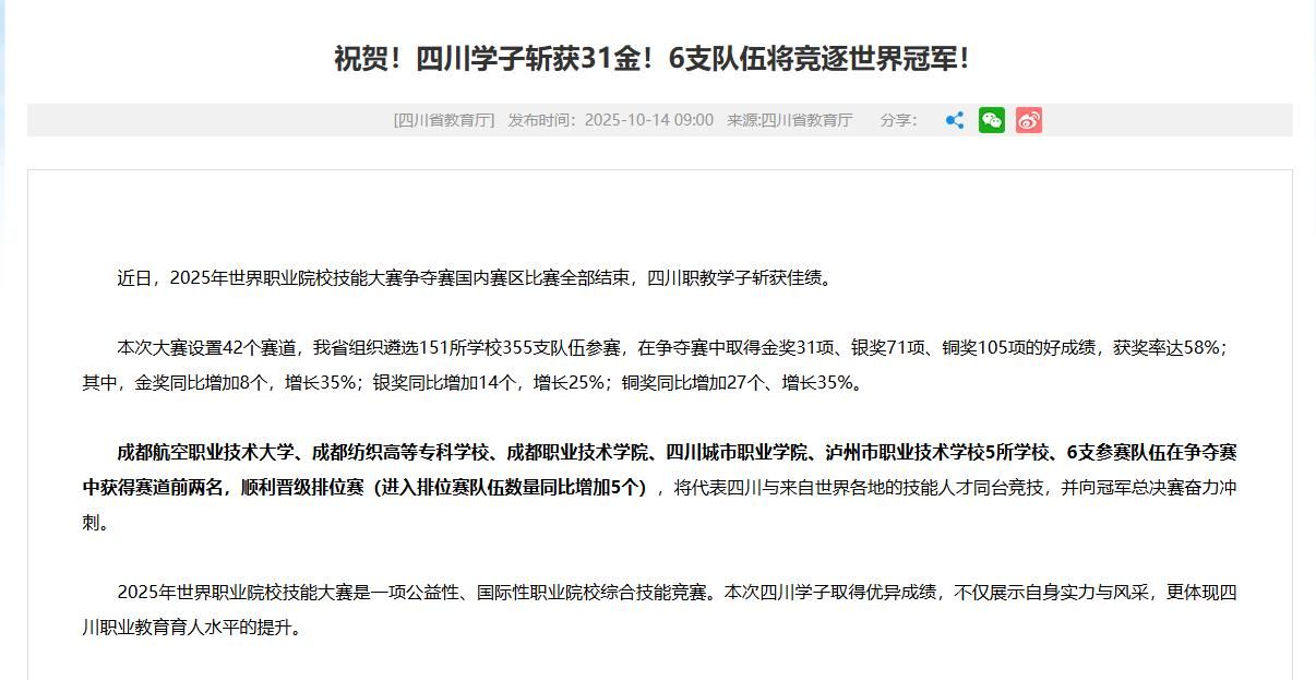近日,2025年世界职业院校技能大赛争夺赛国内赛区比赛全部结束,四川职教学子斩获佳绩。