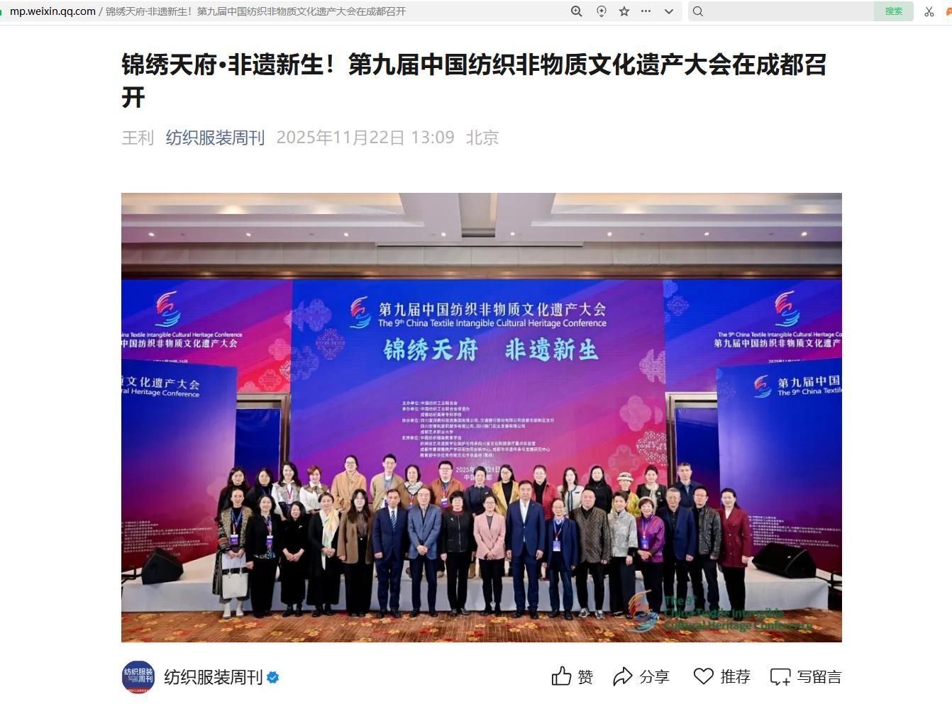 为深入贯彻落实习近平总书记关于“扎实做好非物质文化遗产系统性保护”的重要指示精神,推动优秀传统文化与现代时尚、高等教育深度融合,11月21日,第九届中国纺织非物质文化遗产大会在成都成功举办。本届大会以“锦绣天府·非遗新生”为主题,着力研讨如何将优秀传统文化基因与现代时尚设计、高等教育体系进行系统性融合,聚焦现代设计价值转化与市场应用,重点传播高校非遗人才培养的成功模式,在巴蜀大地上共同叩响纺织非遗通向未来的宏伟篇章,为行业高质量发展注入创新动能。