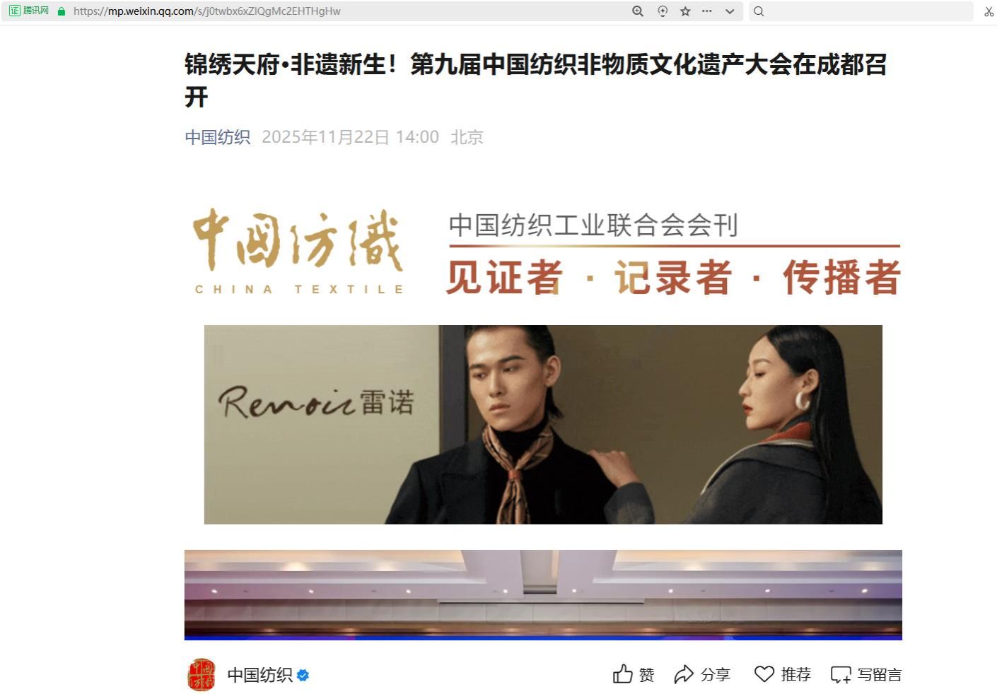 为深入贯彻落实习近平总书记关于“扎实做好非物质文化遗产系统性保护”的重要指示精神,推动优秀传统文化与现代时尚、高等教育深度融合,11月21日,第九届中国纺织非物质文化遗产大会在成都成功举办。本届大会以“锦绣天府·非遗新生”为主题,着力研讨如何将优秀传统文化基因与现代时尚设计、高等教育体系进行系统性融合,聚焦现代设计价值转化与市场应用,重点传播高校非遗人才培养的成功模式,在巴蜀大地上共同叩响纺织非遗通向未来的宏伟篇章,为行业高质量发展注入创新动能。