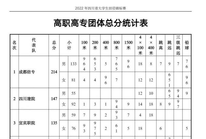 11月19日,由四川教育厅主办、四川省大学生体育协会执行、西南交通大学承办的2022年四川省大学生田径锦标赛在西南交通大学犀浦校区拉开帷幕。经过两天紧张精彩的角逐,我校代表队最终获得6金5银10铜,以领先第二名67分的优势夺得高职高专组团体总分第1名,同时获得高职高专组男子团体总分第1名、女子团体总分第2名。