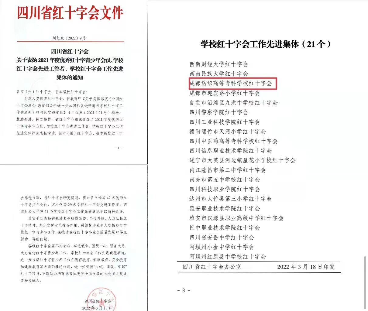 3月18日,四川省红十字会发出表扬通知,对2021年度优秀红十字青少年会员、学校红十字会先进工作者、学校红十字会工作先进集体进行表扬,我校红十字会荣获四川省学校红十字会工作先进集体称号。全省获此殊荣的学校共21所。