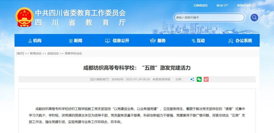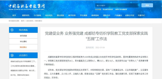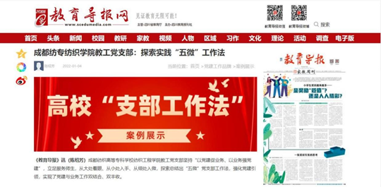 近年来,纺织学院教工党支部在学校党委和学院党总支正确领导下,坚持党建引领,持续加强支部的思想建设、组织建设和作风建设,紧紧围绕学校“三心双艺”和学院“初心织梦”党建工作品牌建设,创新支部工作方法,推进党建与业务深度融合。党总支总结提炼的“初心织梦”党建工作品牌在2021年学校党建工作品牌创建活动中被评选为三等奖。支部总结提炼的“五微”工作法在2021年学校优秀“支部工作法”评选活动中被评选为一等奖,作为学校优秀“支部工作法”上报省委教育工委参加评选、展示,并作为高校“支部工作法”案例,先后被四川省教育厅官网、教育导报网、中国高职高专教育网、现代职教网等15家媒体宣传报道。支部以“五微”支部工作法为载体,打造支部党建工作特色和亮点,推动支部党员教育管理和党建工作不断取得新成效。