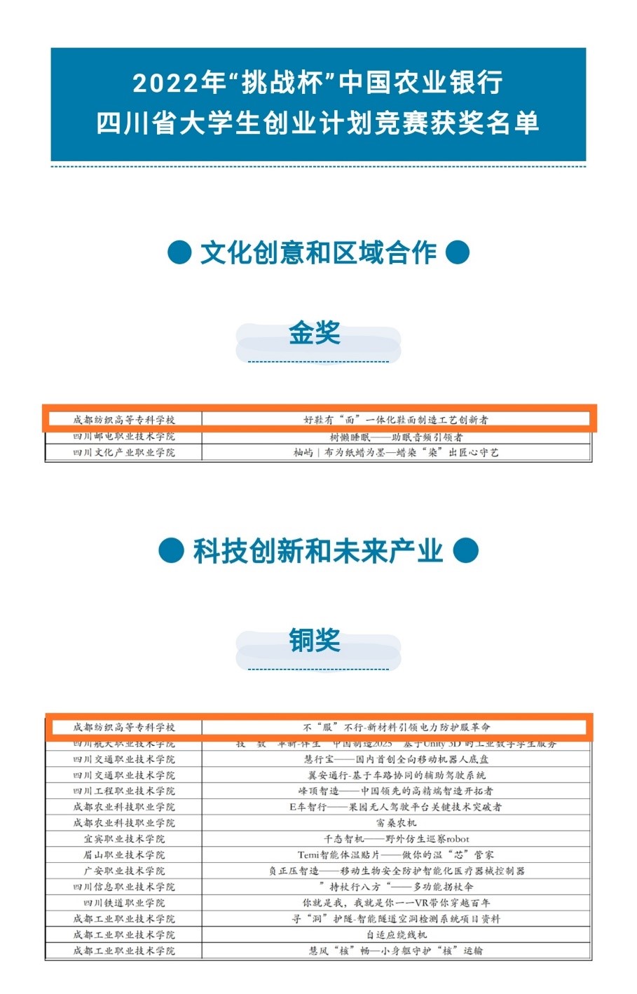 6月18日,2022年“挑战杯”中国农业银行四川省大学生创业计划竞赛终审决赛成绩揭晓,我校学生喜获金奖1个、铜奖1个。