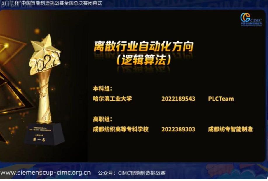 9月29日,2022年CIMC“西门子杯”中国智能制造挑战赛线上颁奖仪式隆重举行。由我校智能制造与装备学院机器人202班唐添、蒋远东和机器人212班明翼3位同学组成的“成都纺专智能制造”队在离散行业自动化方向(逻辑算法)赛项中,以全国第一名的骄人成绩,荣获总决赛特等奖。