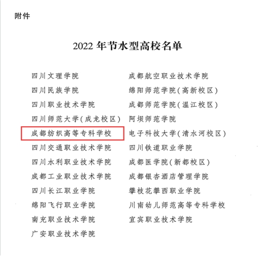 近日,四川省水利厅、教育厅、机关事务管理局联合公布2022年节水型高校名单,我校成功获评四川省2022年节水型高校。