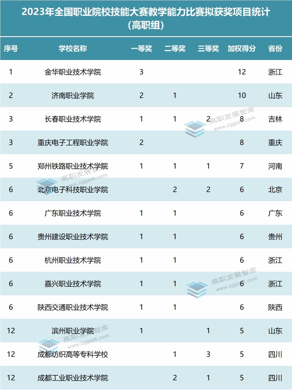 12月10日,2023年全国职业院校技能大赛教学能力比赛拟获奖项目名单公示结束。据高职发展智库统计,高职组共获奖244项,其中一等奖44项、二等奖79项、三等奖121项;247项拟获奖作品来自全国211所高职院校。该智库对不同级别奖项的获奖难易程度和价值赋予了不同的权重加分,根据赋分标准和加权得分,我校以卓越的教学实力和教学技能,位列全国第12名(并列)、四川省第1名(并列)。