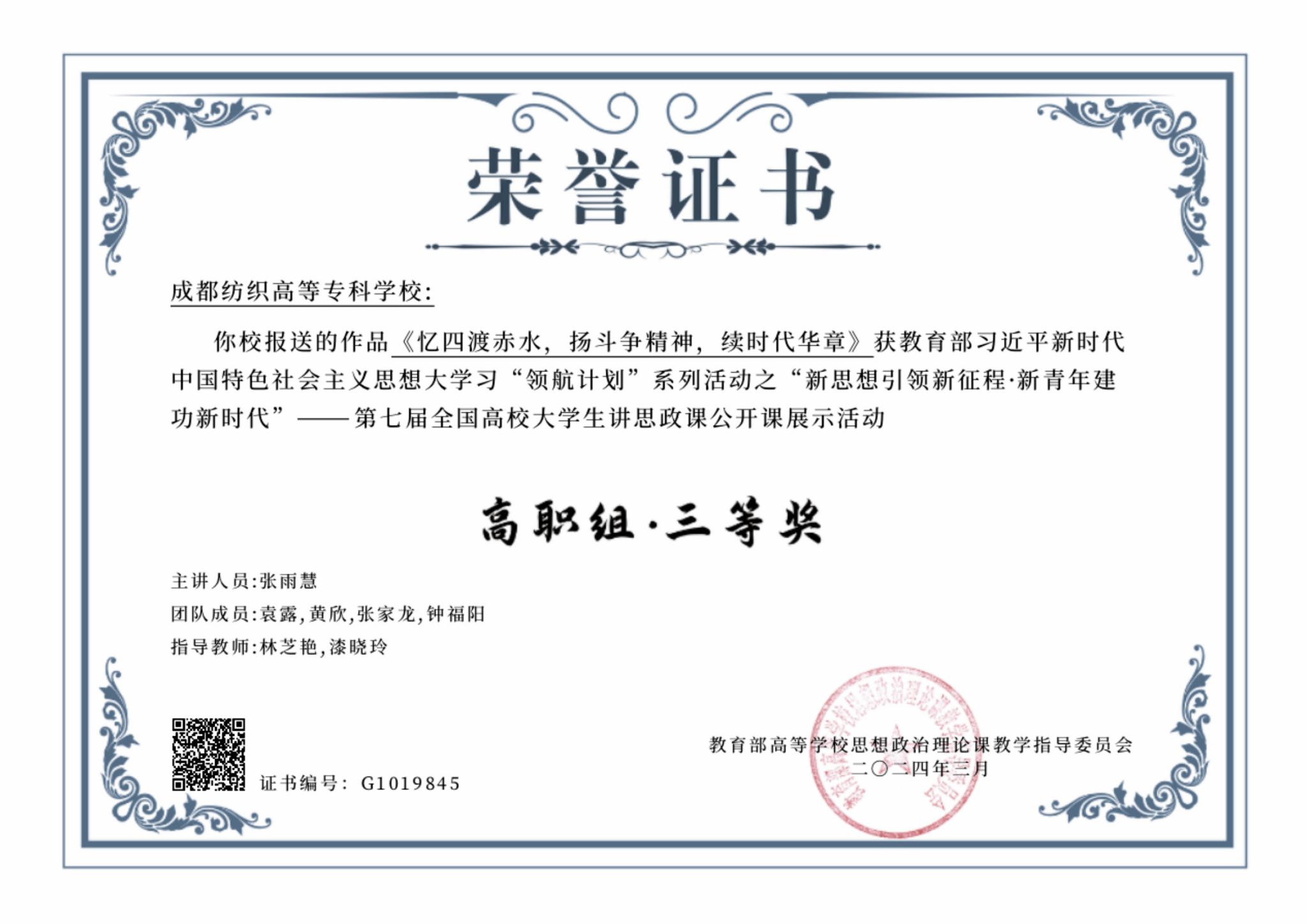 学校党委历来重视马院建设,学校党委常委会、校长办公会定期专题研究马院工作,学校党委书记直接联系马院,全面指导和支持学院建设。近年来,我校马院在学校党委和行政的坚强领导下,坚持“马院姓马、在马言马”的鲜明政治导向和办学原则,全面贯彻落实习近平总书记关于思政课是落实立德树人根本任务关键课程的要求,系统推进思政课改革和建设。在课程建设方面,学院高质量建成省级精品在线开放课程1门、省职业院校思政示范课程3门;在师资队伍建设方面,学院教师获评四川省优秀共产党员、四川省“四有”好老师、四川学校思政课教师年度人物等荣誉称号,学院漆晓玲教授领衔的教学团队分别获得省级课程思政示范教学团队和省级思想政治教育名师工作室立项,学院教师斩获全国高校思政课教学展示一等奖1项和省级“精彩一课”特等奖3项、一等奖1项;在实践教学方面,学院牵头打造“厚植衣被天下情怀·感悟纺织非遗之美”行走的思政课实践品牌,指导学生分别在第六届“我心中的思政课”微电影比赛中获全国二等奖,在第七届“我心中的思政课”微电影中获全国短视频组一等奖、长视频组二等奖,在第七届大学生讲思政课中获得全国三等奖,在大学生讲宪法比赛中获四川省二等奖。