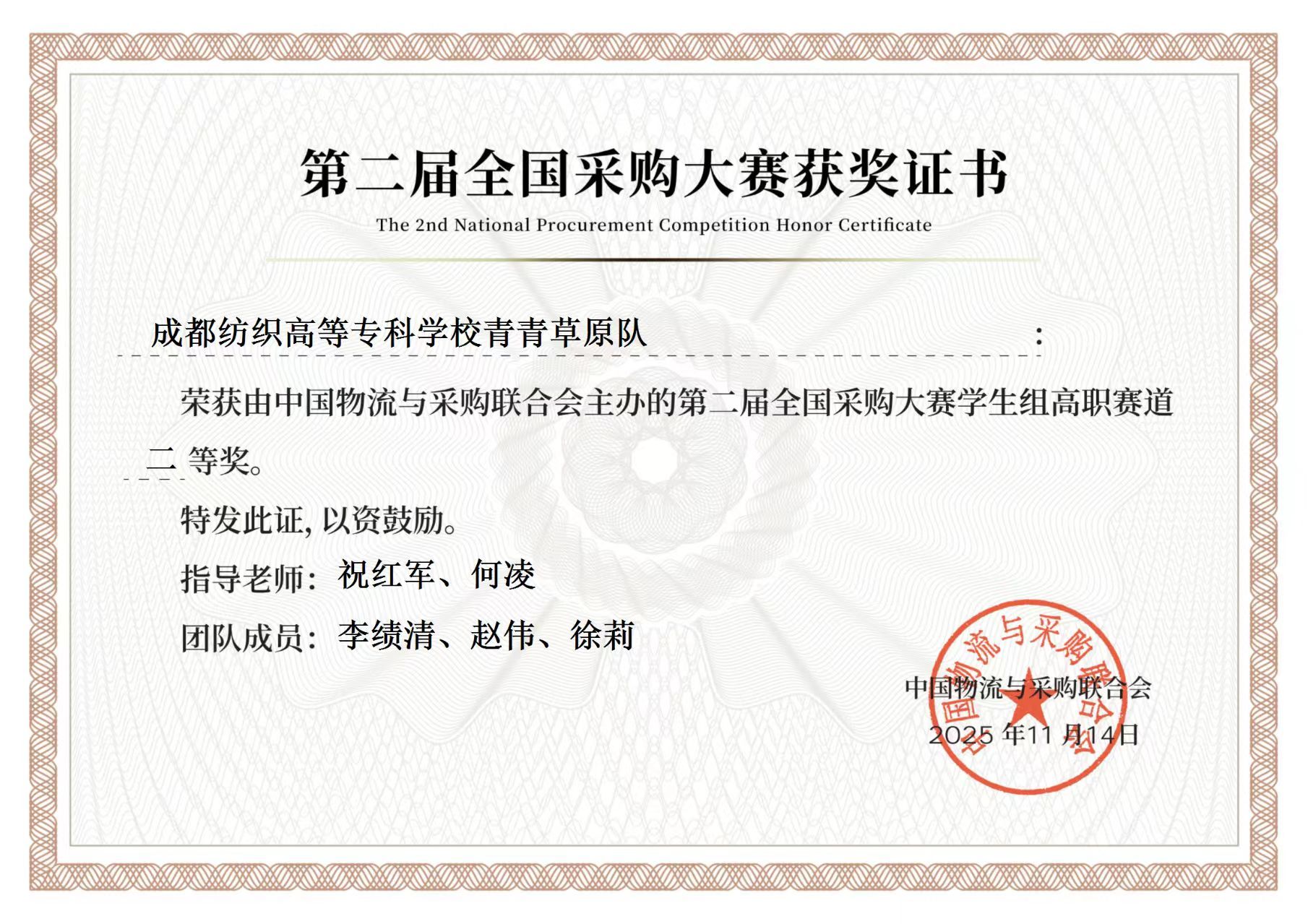 由中国物流与采购联合会主办的第二届全国采购大赛学生组决赛于2025年11月8日圆满落幕。经过来自全国高职院校的341支代表队的多轮激烈角逐,我校数字经贸与管理学院两支参赛队伍均荣获高职赛道二等奖,充分展现了供应链运营专业学子的扎实专业素养与实战能力。
