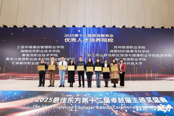 11月24日,由最佳东方招聘求职平台主办的2025最佳东方教育论坛在杭州举行。在同期举办的2025第十二届旅游服务业表彰盛典上,我校因在旅游类专业人才培养领域的扎实积淀、创新实践与行业贡献,荣获“优秀人才培养院校”称号,彰显了业界对学校办学质量与育人成效的高度认可。